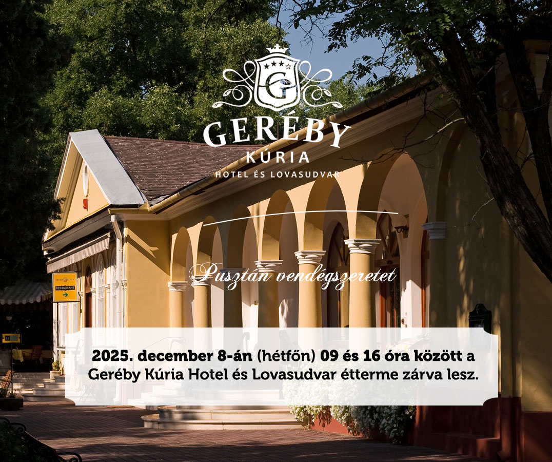Tájékoztatjuk Önöket, hogy 2025. december 8-án (hétfőn) 09 és 16 óra között a Geréby Kúria Hotel és Lovasudvar étterme zárva lesz.